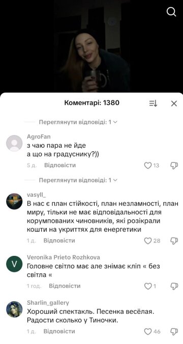Популярная украинская певица Тина Кароль представила отрывок новой песни, ставшей откликом на частые отключения электроэнергии и тепла в Украине, вызванные российскими ударами по энергетической инфраструктуре. Видео с треком она разместила на своей странице и указала, что композиция призвана поддержать соотечественников в непростое время.